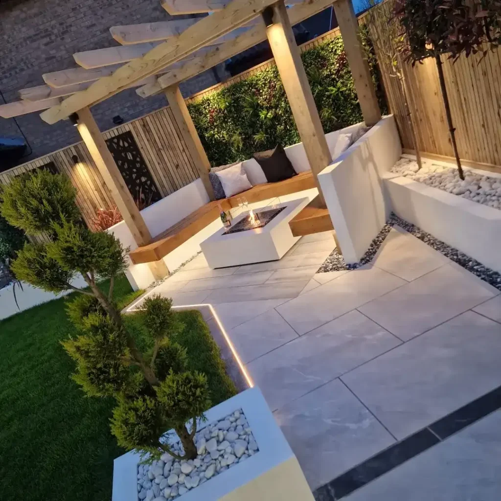 This is absolutely architectural perfection.The way this space is designed with those clean geometric lines and multiple levels creates such a sophisticated, spa like atmosphere. That modern white fire feature is like a piece of outdoor sculpture it’s so sleek and dramatic as the centerpiece.