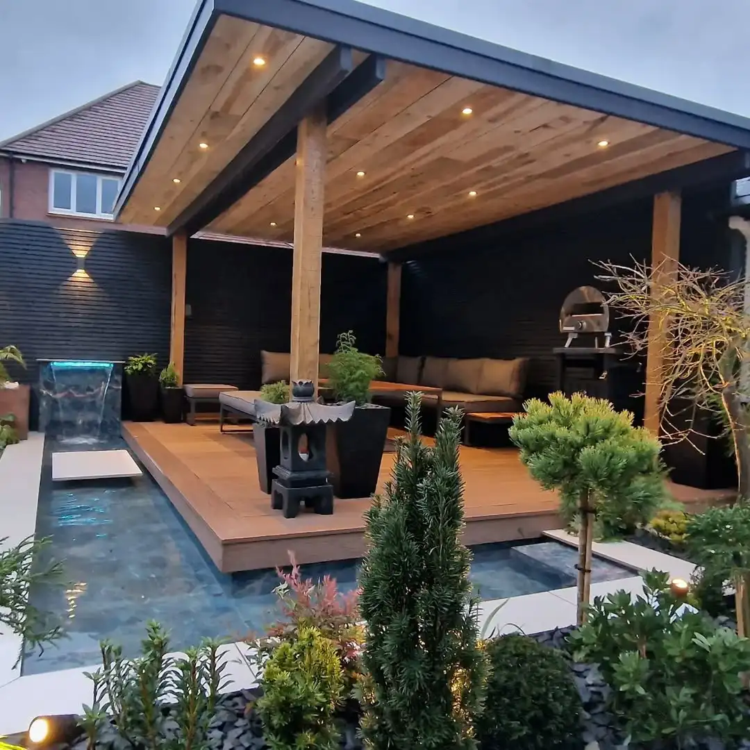 This backyard is like a modern oasis. That raised wooden deck with the sleek pergola creates such a beautiful floating effect above those gorgeous water features. The recessed lighting in that wood planked ceiling gives off such a warm, sophisticated glow that makes everything feel so inviting at dusk.