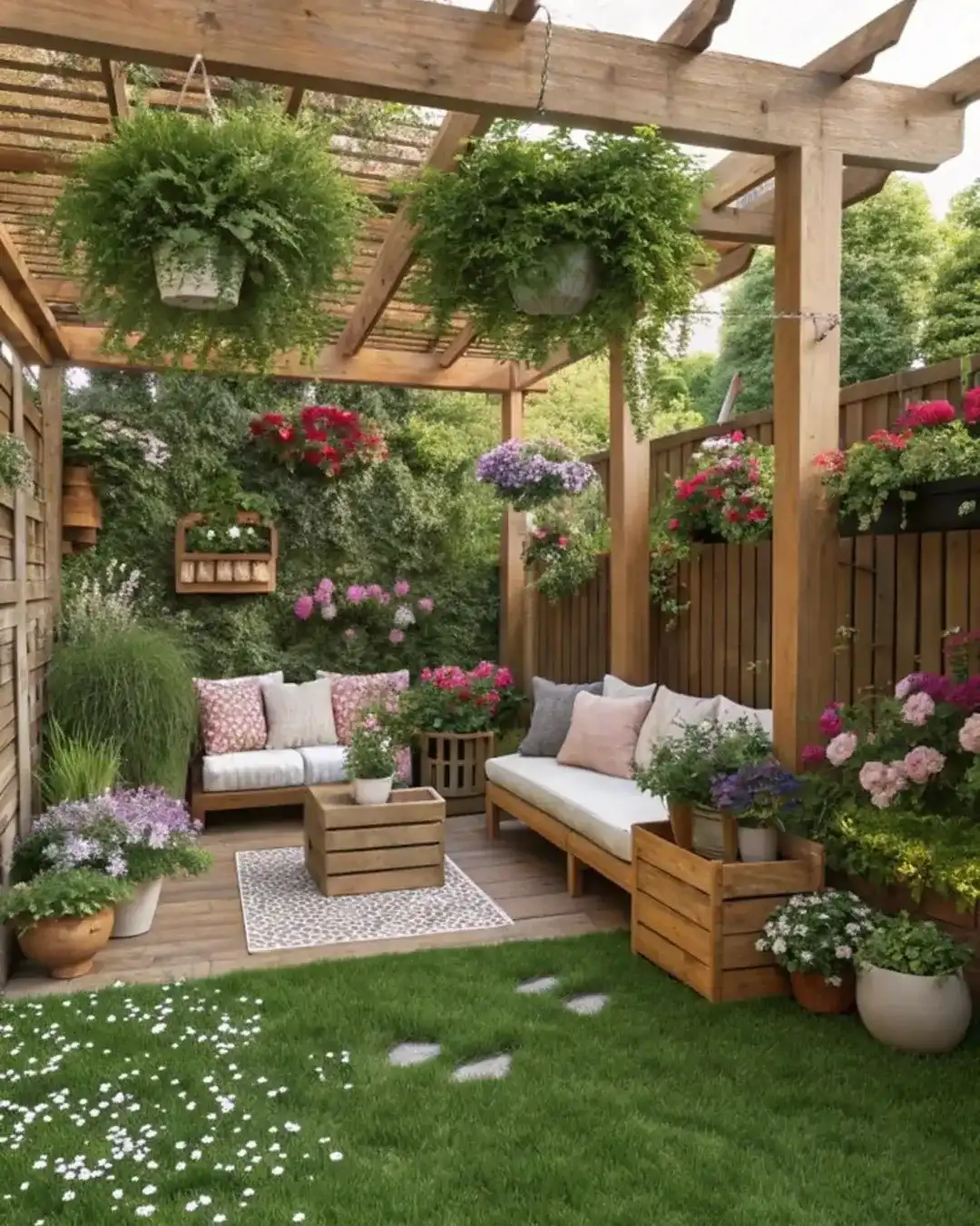 The whole space is just bursting with blooms at every level, from the hanging baskets to all those potted plants tucked around the seating area. That little patch of lawn with the scattered white flowers feels like you’re sitting in the middle of a fairy tale. This is definitely cottage garden goals it’s romantic, abundant, and feels like nature’s own outdoor living room.