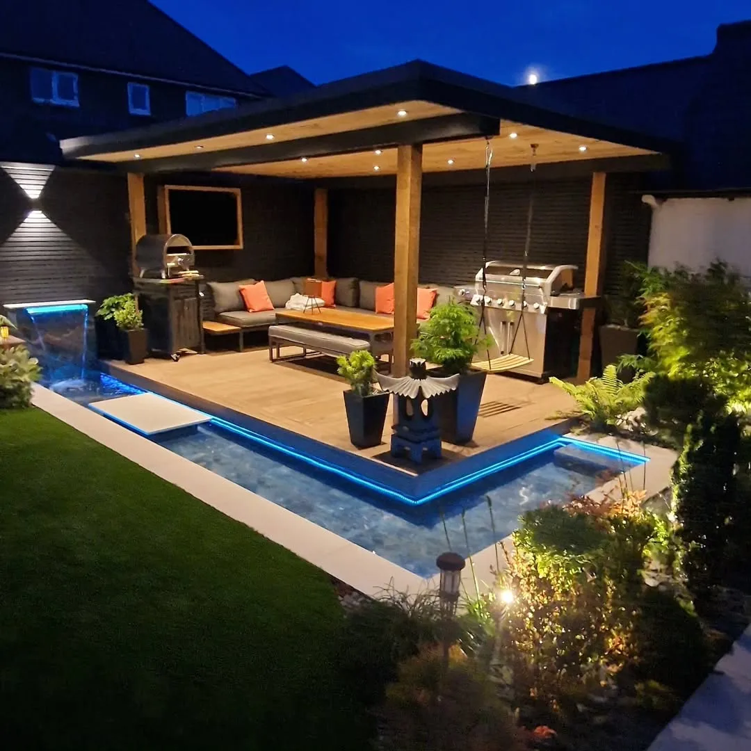 This is pure luxury. That electric blue LED lighting around the pool creates such an incredible nighttime ambiance it’s like having your own private resort right in the backyard. The way that wooden pavilion extends right over the water is brilliant design, making the whole space feel integrated and flowing.