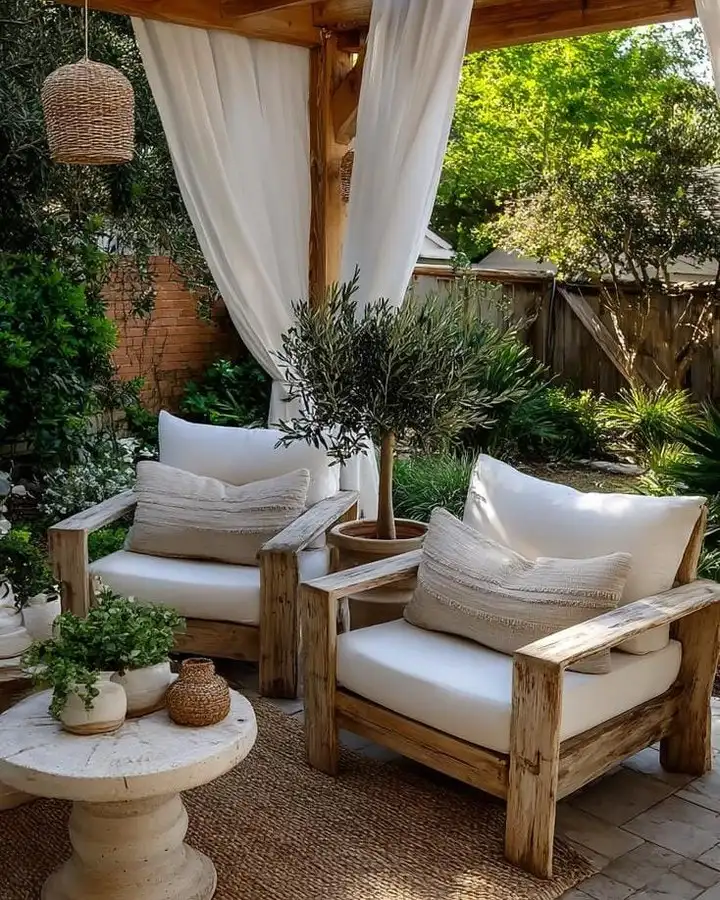 This outdoor nook is pure Mediterranean elegance.Those billowing white curtains draped from the wooden pergola create such a romantic, resort like atmosphere you can almost feel the gentle breeze moving through them. The chunky teak furniture looks so substantial and inviting with those plush cream cushions and textured throw pillows.