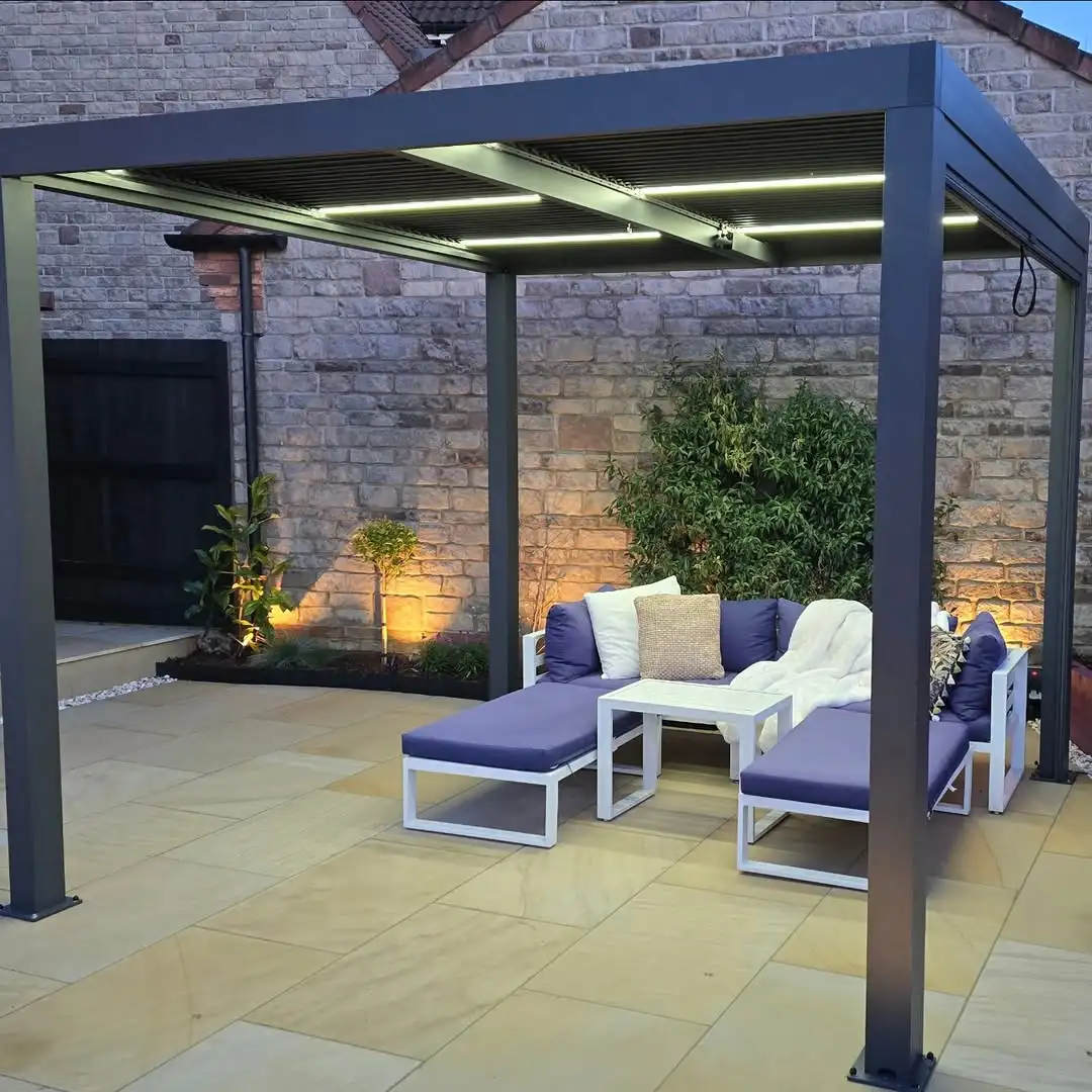 19. Modern Metal Pergola with LED Lighting and Stone Wall Backdrop