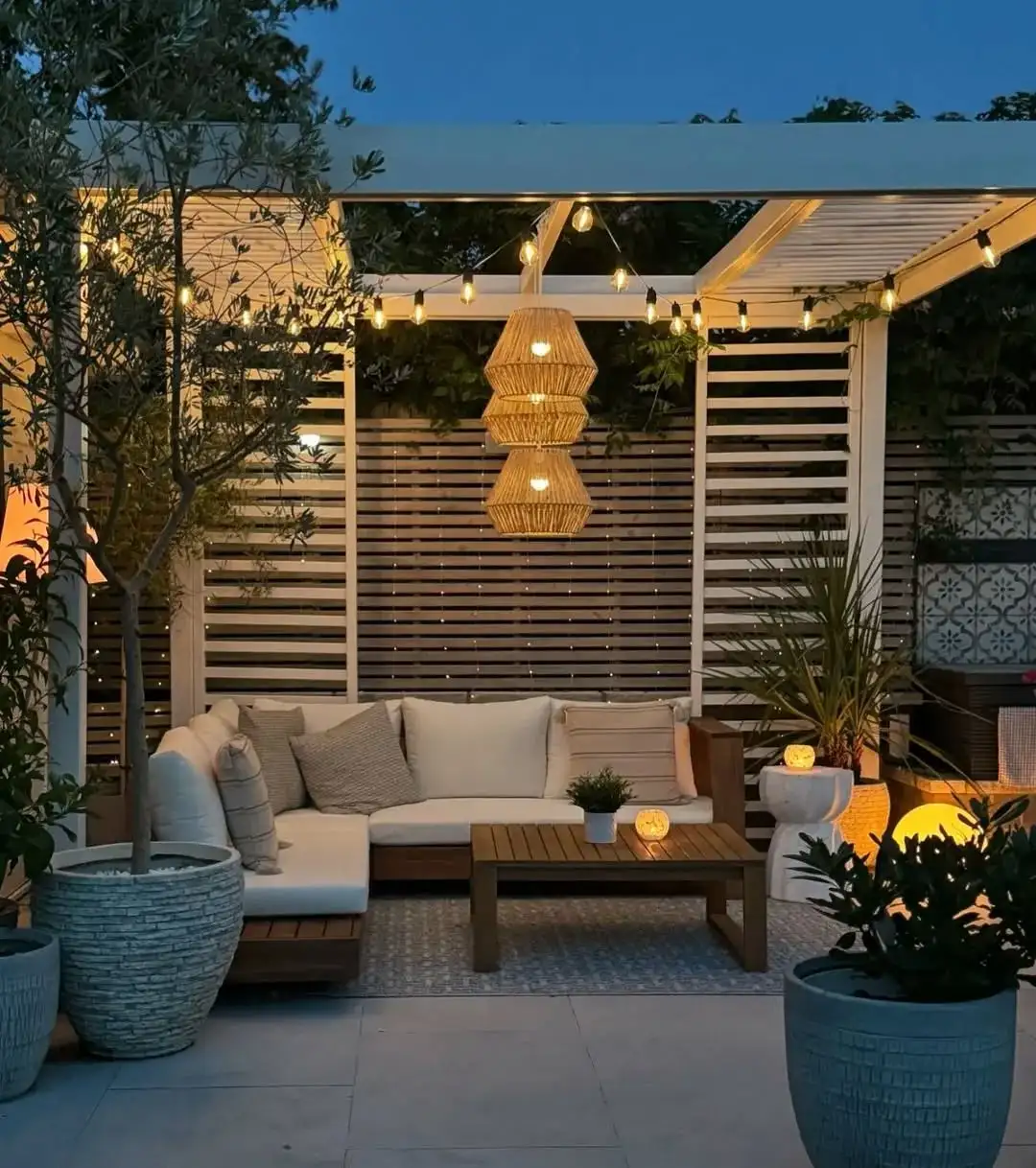 This patio is absolutely stunning in the evening light.Those three tiered woven pendant lights hanging from the sleek white pergola create such a sophisticated focal point they look like modern art pieces. The horizontal wood slat privacy screen adds perfect structure while still letting light filter through beautifully.