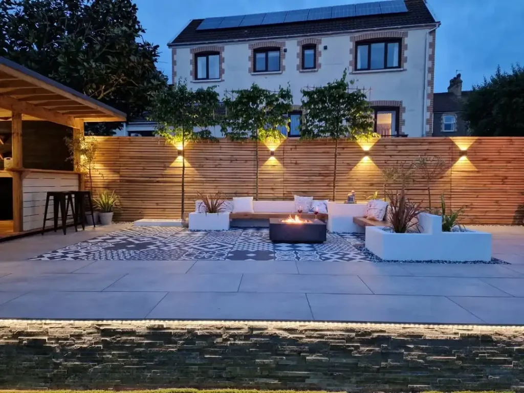 That sleek white fire table as the centerpiece is perfect for gathering around on cool evenings. I love how the uplighting on those vertical wood screens creates these gorgeous shadow patterns and really highlights the craftsmanship of the structure.