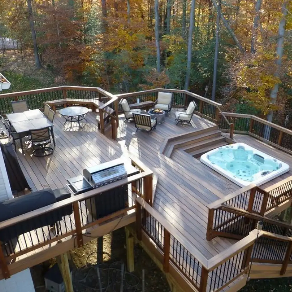 You can see how the deck curves and flows naturally, creating distinct spaces without feeling choppy. That autumn forest backdrop is just stunning, imagine soaking in that hot tub surrounded by all those golden trees. The wood railings and decking look so well crafted, and there’s plenty of room for entertaining or just spreading out with family. Pure outdoor luxury right here