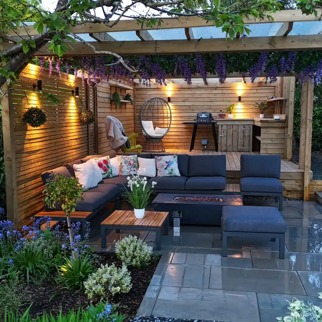 This is like a secret garden paradise. I love how they’ve created these distinct levels with the raised wooden deck for the outdoor kitchen area and that sleek lower patio with the modern sectional. That hanging egg chair is such a fun focal point, and those string lights add the perfect warm glow for evening entertaining.
