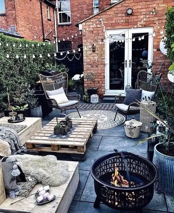 Talk about making the most of a small city space. This little urban courtyard has so much personality packed into every corner. That decorative fire bowl is absolutely stunning as the centerpiece, and I’m loving how they mixed different seating options wicker chairs, that cool pallet daybed, and cozy floor cushions.