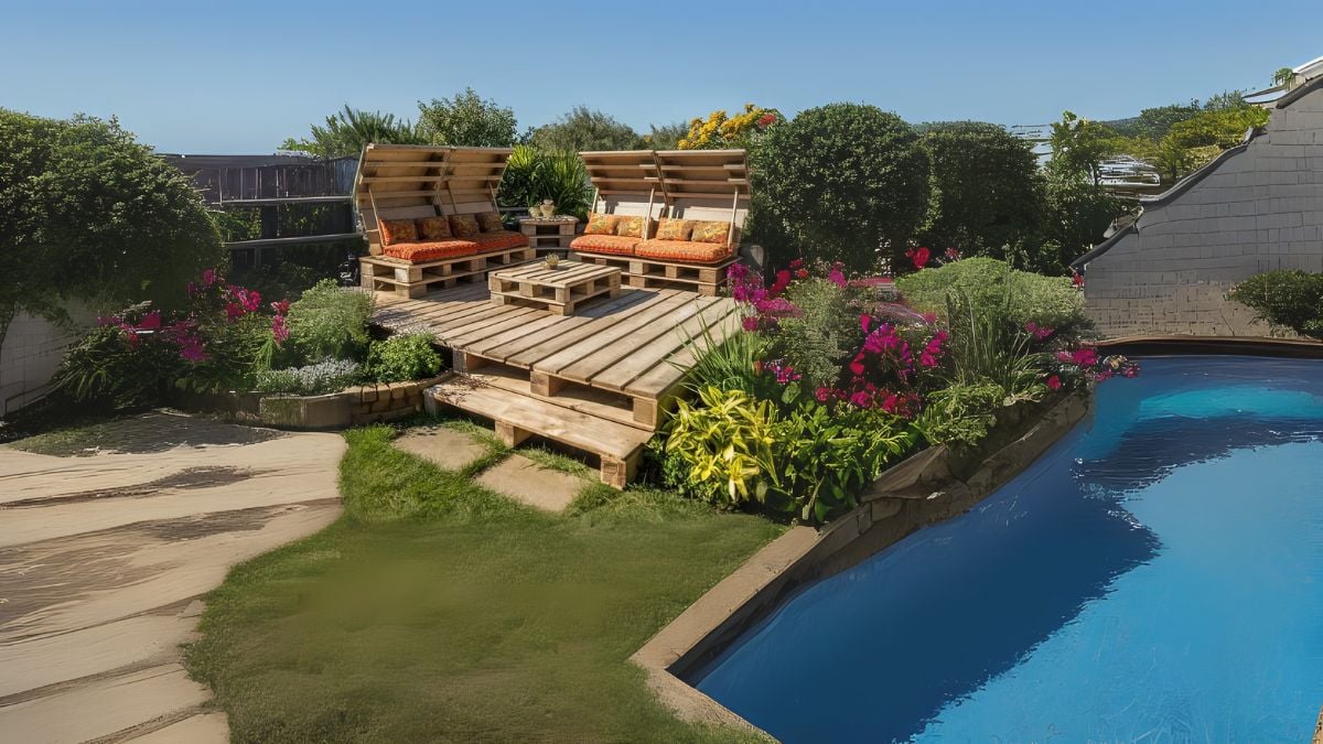 This arrangement works for small yards where space must be maximized. You could easily replicate this setup with reclaimed pallets, basic tools, and a weekend of work. The elevated design also helps avoid ground moisture issues common with ground-level patios.