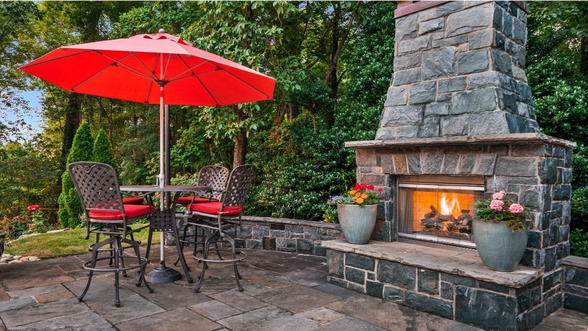 The given cheerful patio shows that flagstone can work beautifully in smaller spaces, too. The warm-toned stones create a cozy seating area that’s enhanced by colorful container gardens and flowering plants.