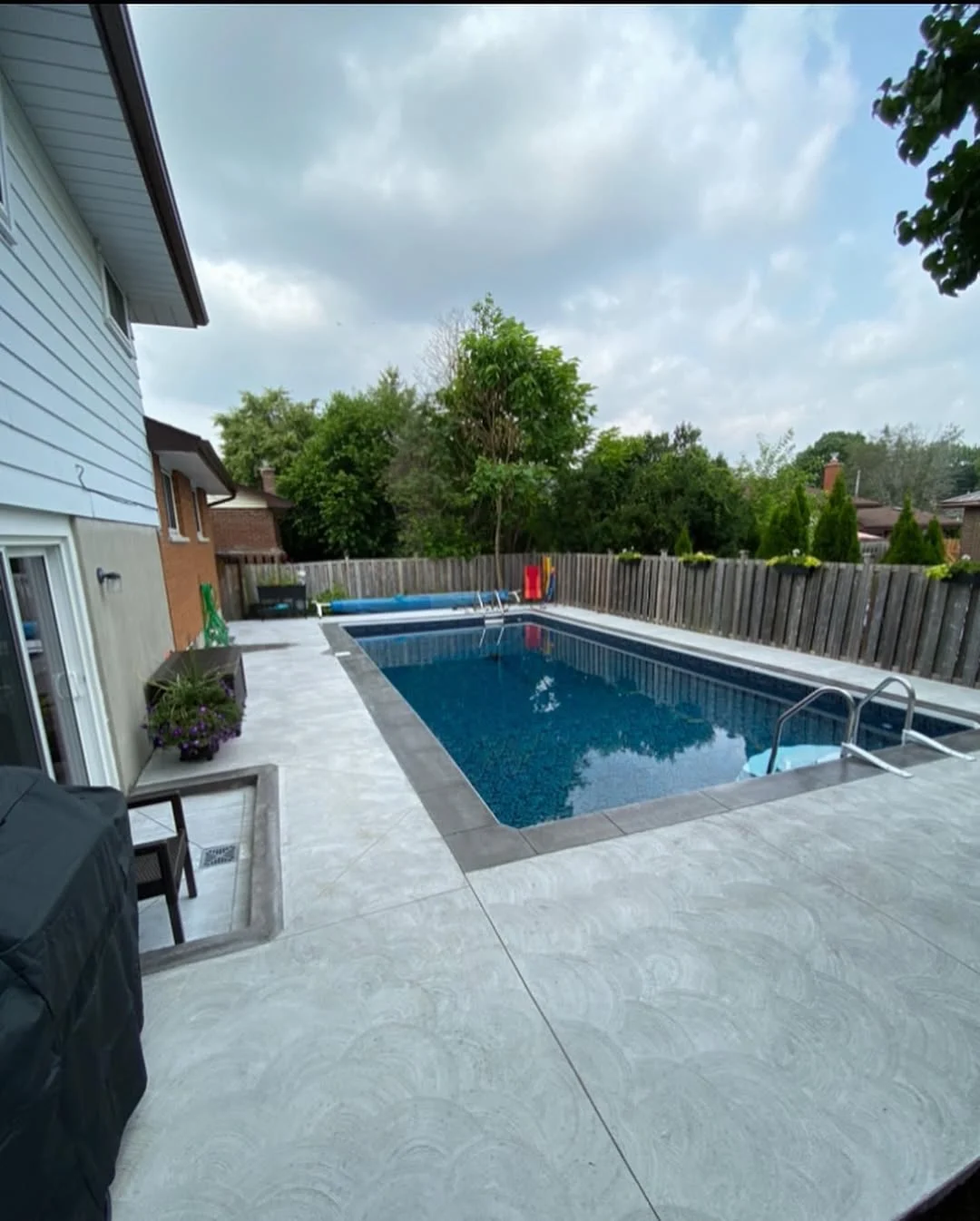 Simple and sleek! This stamped concrete pool deck shows how clean lines can make such a statement. The light gray concrete surrounds the rectangular pool perfectly, providing plenty of space for lounging or walking. I appreciate the subtle decorative pattern stamped into the surface adds interest without being busy.