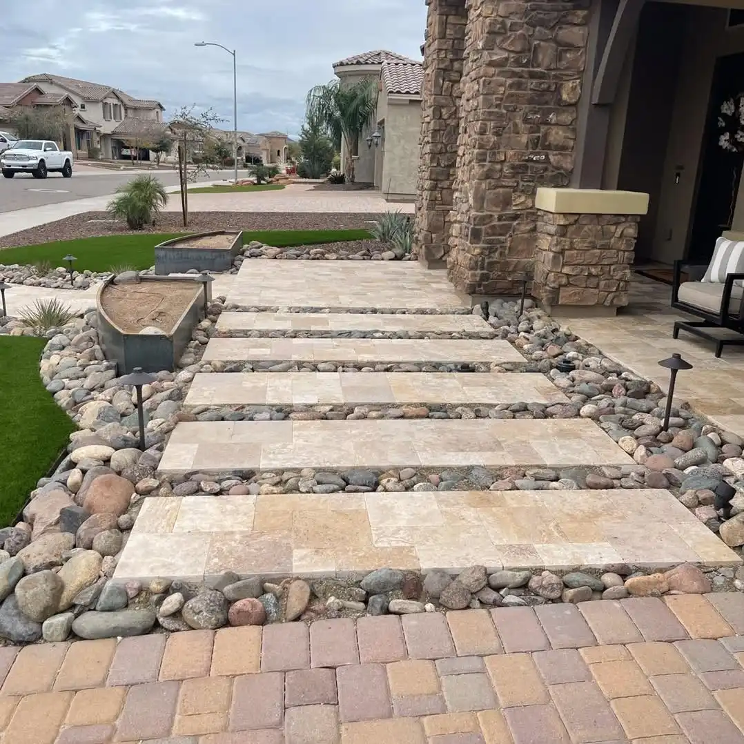 This contemporary desert hardscape demonstrates sophisticated material transitions that create distinct outdoor zones within a cohesive design language. The covered patio features premium travertine pavers in warm earth tones arranged in a Versailles pattern, a multi-sized format that creates subtle visual interest through its irregular yet balanced appearance.