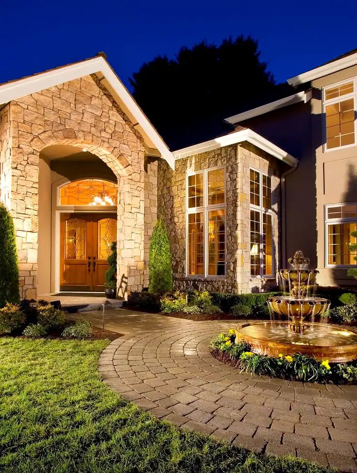 This welcoming front entry showcases beautiful stonework with a grand arched entryway. A curved paver walkway leads to the front door, flanked by manicured plantings. The focal point is a tiered fountain that adds both visual interest and soothing sounds.