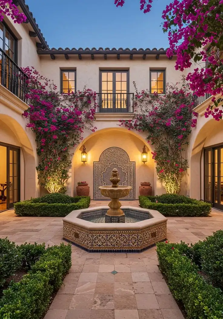 Stepping into this sun drenched Spanish style courtyard feels like a vacation! Terracotta tiles create a warm, inviting floor beneath a sculptural tree that provides dappled shade. White stucco arches frame the space perfectly, leading to a handsome dark wood door.