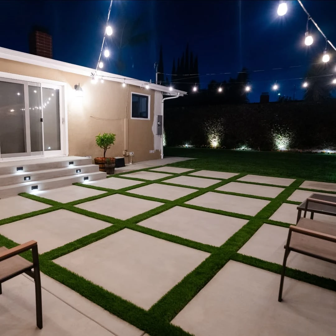 Talk about dramatic nighttime ambiance! This evening shot showcases a brilliantly executed concrete paver grid interspersed with artificial grass strips. The string lights overhead create such a magical atmosphere as they illuminate the clean geometric pattern below.