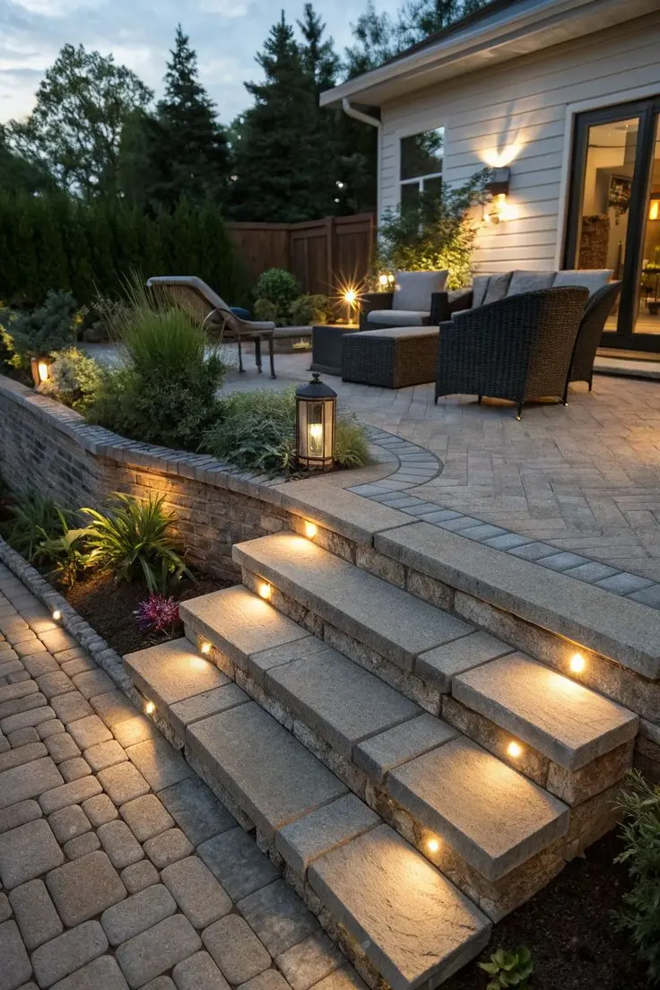 Evening transforms this elegant backyard design with strategic lighting that highlights its best features. Stone steps with built-in LED lights create a dramatic entrance to this raised paver patio. The curved retaining wall includes integrated lighting that washes the garden beds with a warm glow.