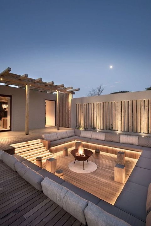 This is next level outdoor living! The sunken wooden deck creates an incredibly intimate conversation area that literally draws people together. The built in seating with plush cushions wraps around the central fire bowl, making this the perfect gathering spot on cool evenings.