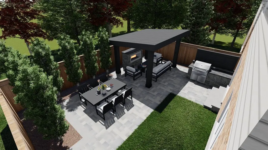 This sleek backyard design is like having your private resort! The contemporary pergola with dark posts and roof creates a defined space for relaxation, while the stone patio provides an elegant foundation. I love how they’ve zoned the yard dining area, lounge seating, and built-in grill station all in one cohesive design.