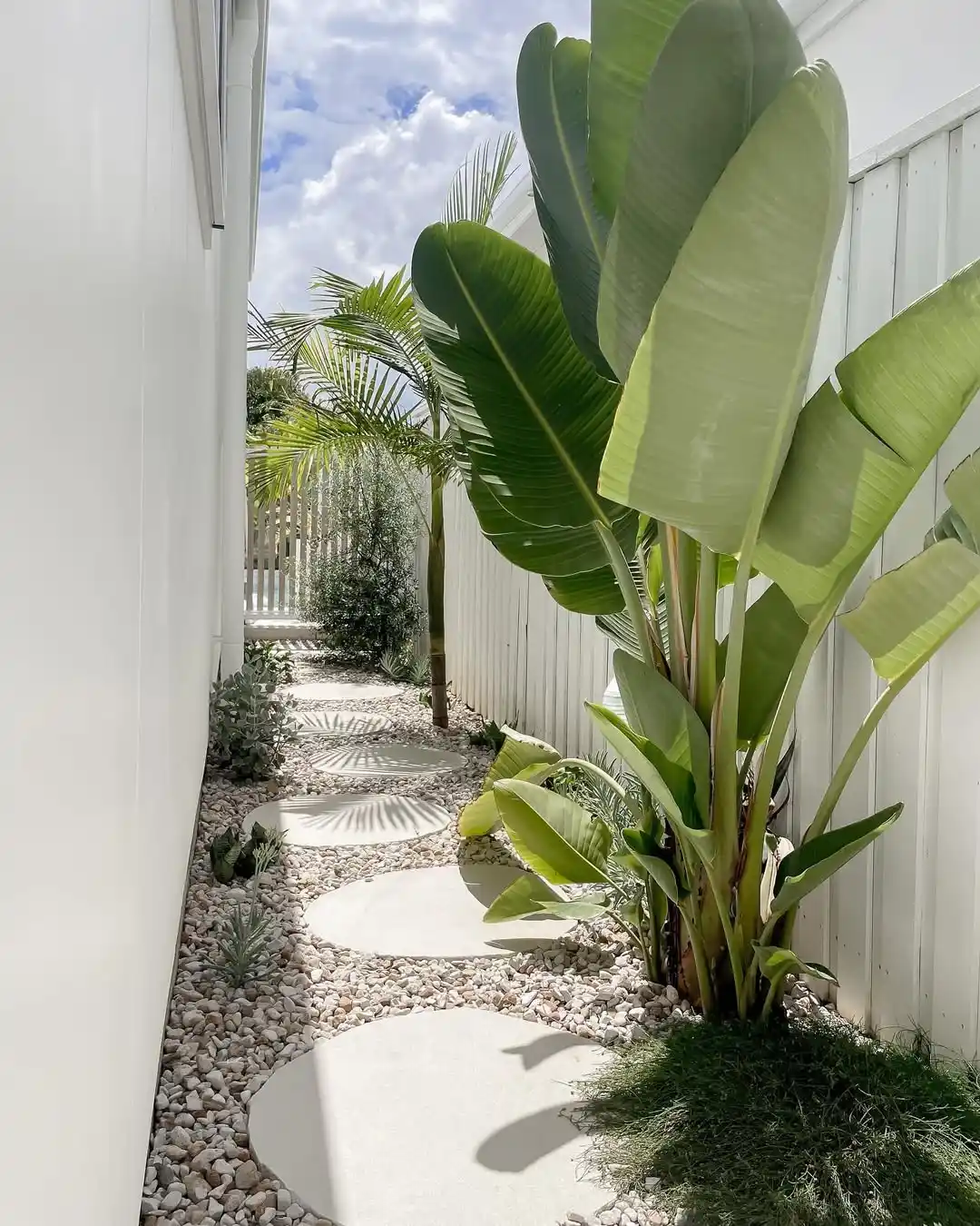 Those massive banana leaves catch the sunlight beautifully, creating these gorgeous translucent green glows. The round concrete stepping stones floating in the white pebbles remind me of lily pads on a pond, so playful yet sophisticated. I love the contrast of the crisp white fence and walls against all those lush greens.
