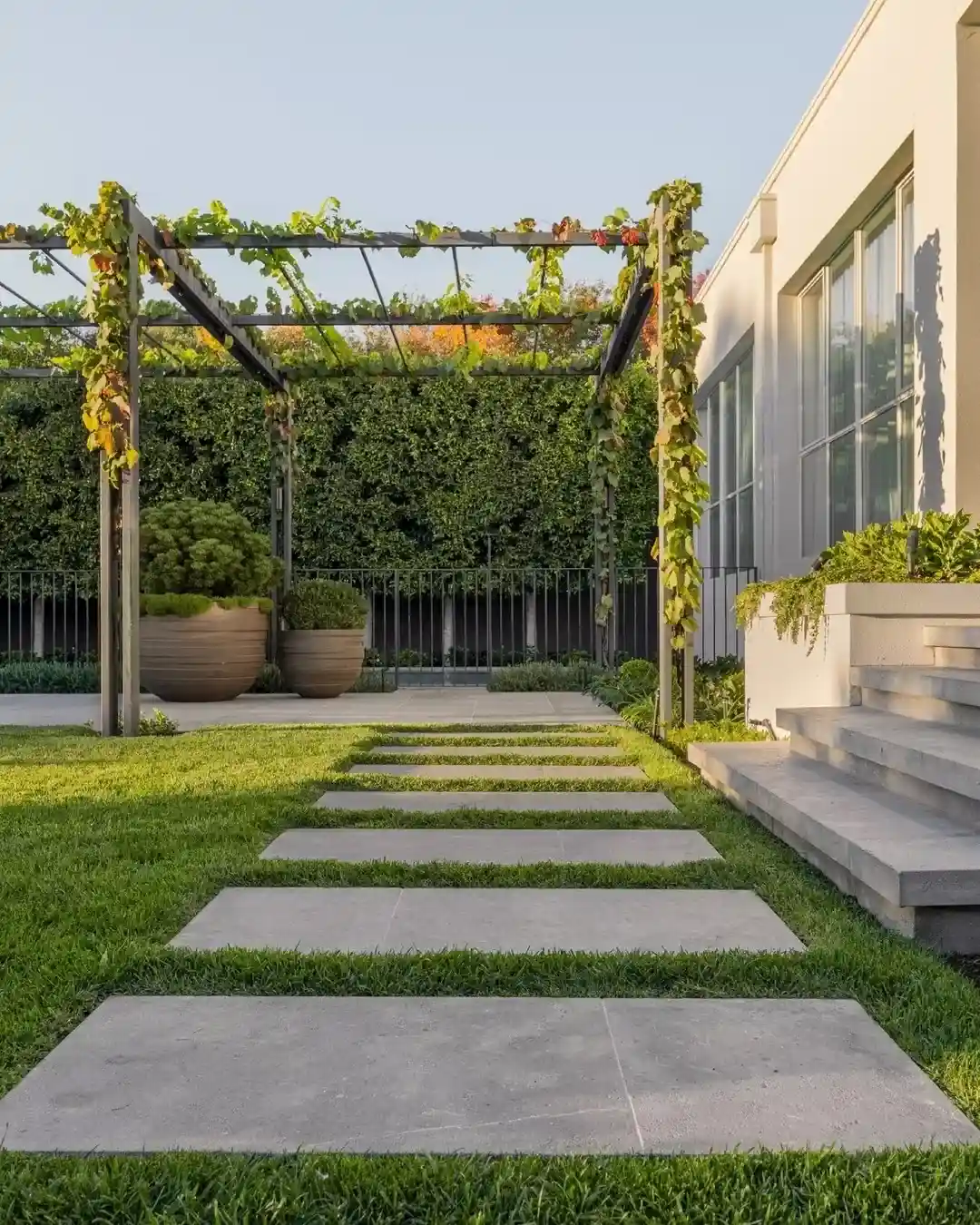 Those oversized concrete pavers set flush with the perfectly manicured lawn create this wonderful rhythm leading to the pergola. The sleek metal pergola frame with climbing grapevines adds this beautiful organic element that will provide dappled shade in summer.