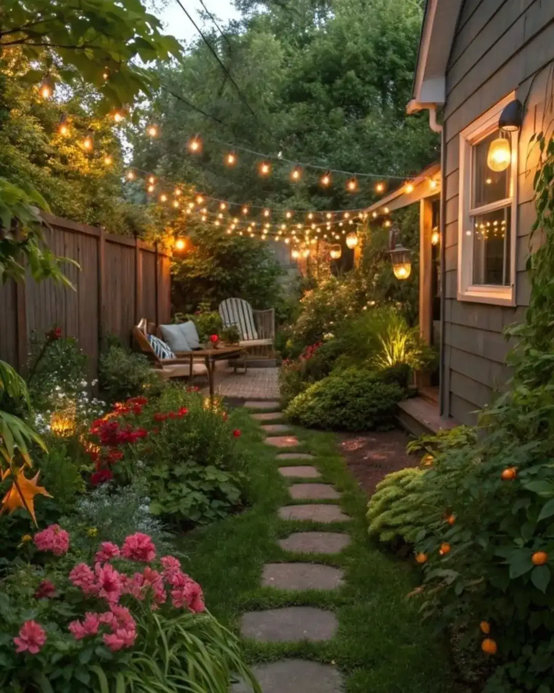 Those crisscrossing string lights create this magical canopy overhead that transforms the whole space. The cottage-style planting is bursting with personality. Look at those vibrant pink peonies and bright red flowers spilling onto the path.