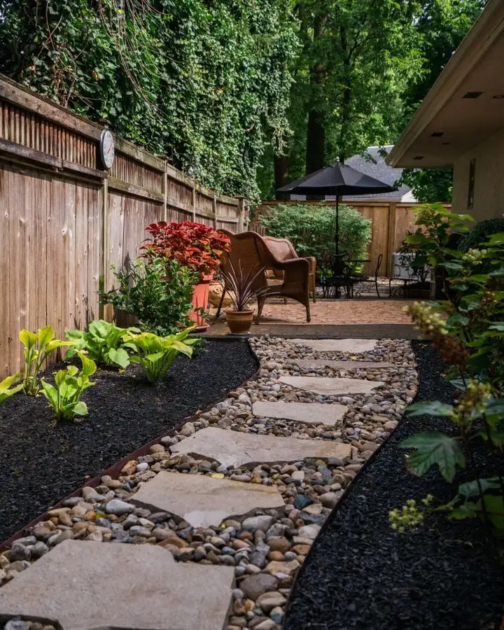And check out that comfy seating area in the back with the umbrella, perfect spot for morning coffee or an evening glass of wine! The river rocks lining the path give it such a natural, earthy feel. This is the kind of side yard that makes you slow down and breathe a little deeper.