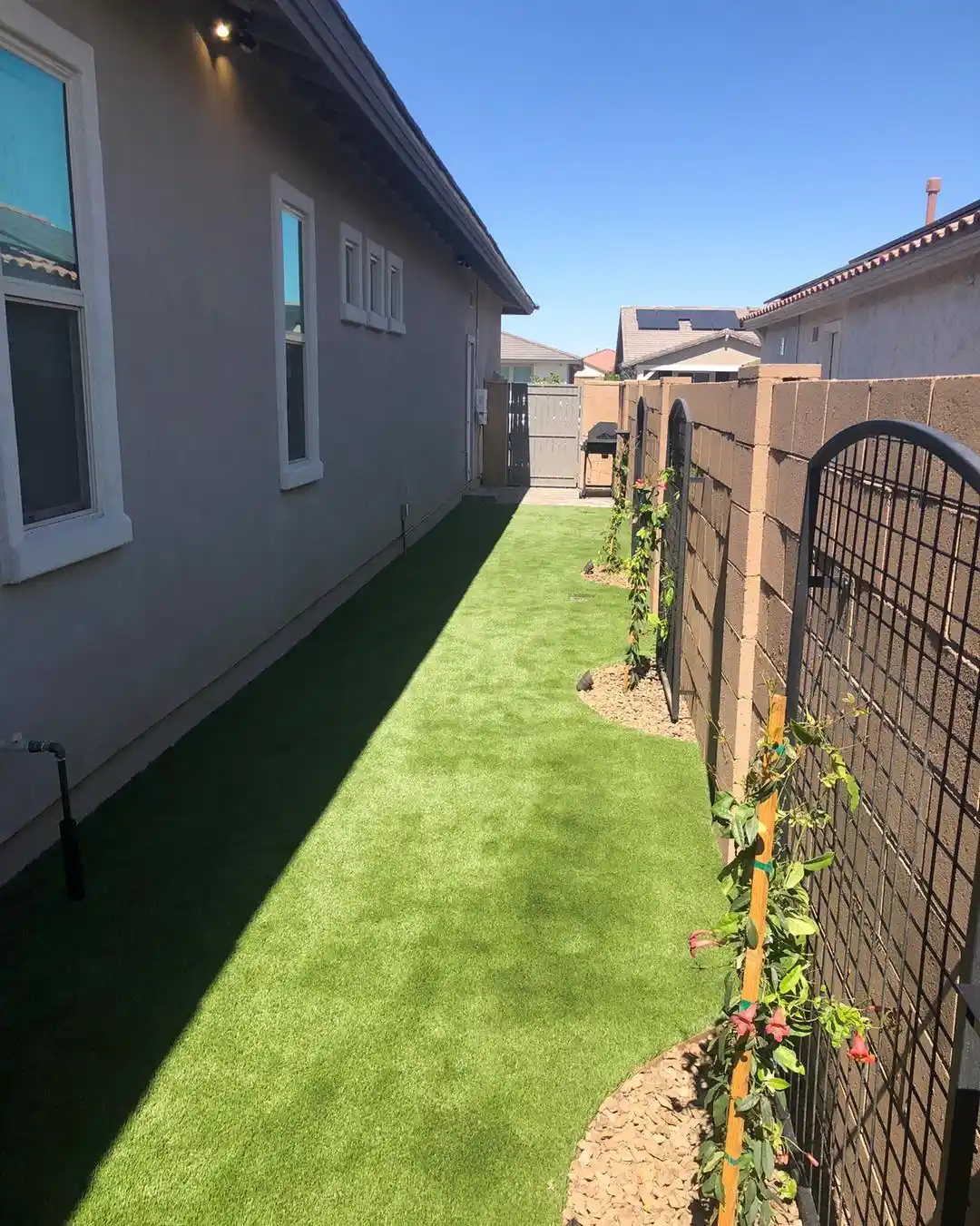 The black metal gate and trellis panels provide great support for the climbers while adding architectural interest. That neat rock border helps keep the turf edge defined and provides drainage away from the fence. This has to be in the Southwest or a similar arid region based on the stucco walls and block fence. Perfect setup for a dog run or kids’ play zone where natural grass would struggle.