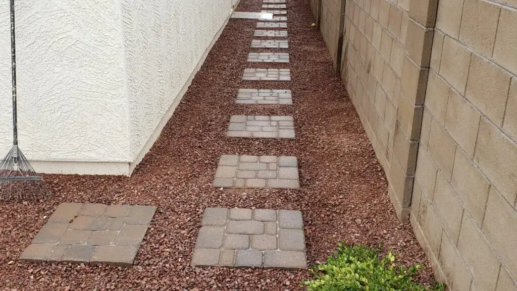 Those reddish-brown crushed rocks are a smart choice for areas with water restrictions – zero maintenance and excellent drainage. The simple paver stepping stones create a clear path without any fuss. I appreciate how they’ve aligned the stones in that perfect zigzag pattern that feels natural for walking pace.