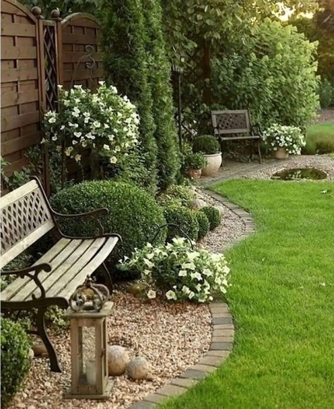 I love that rustic wooden lantern, such a charming decorative element! The cedar fence with that curved gate adds so much character. There appears to be a small water feature or bird bath in the distance, which would attract wildlife. This garden has matured over time, it has that established, layered look that can’t be created overnight.
