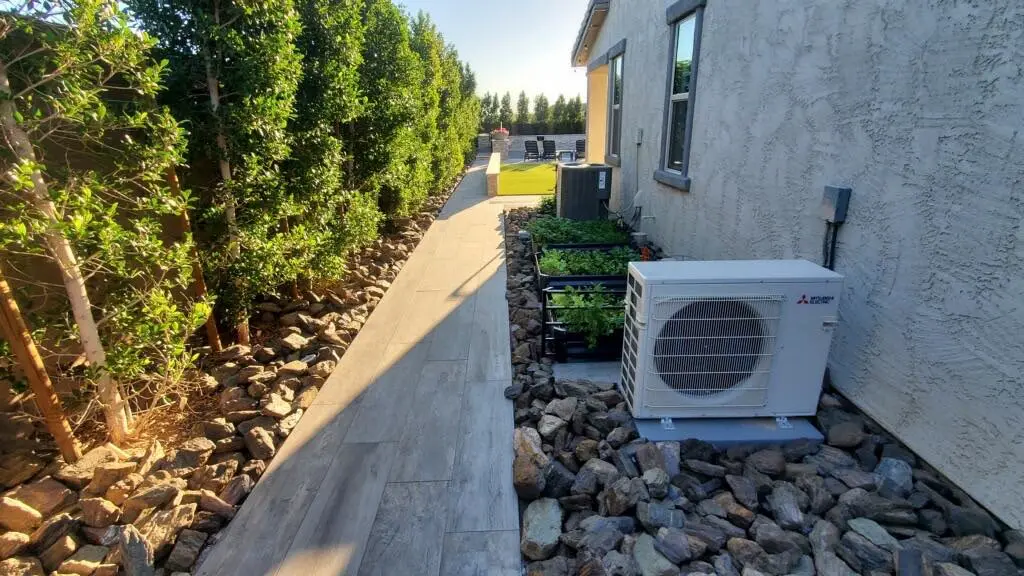 I like how they’ve kept the design super simple with just the necessities, perfect for a low-maintenance, functional side passage. The concrete utility pad in the foreground might be for an AC unit or other equipment that needs a firm base.