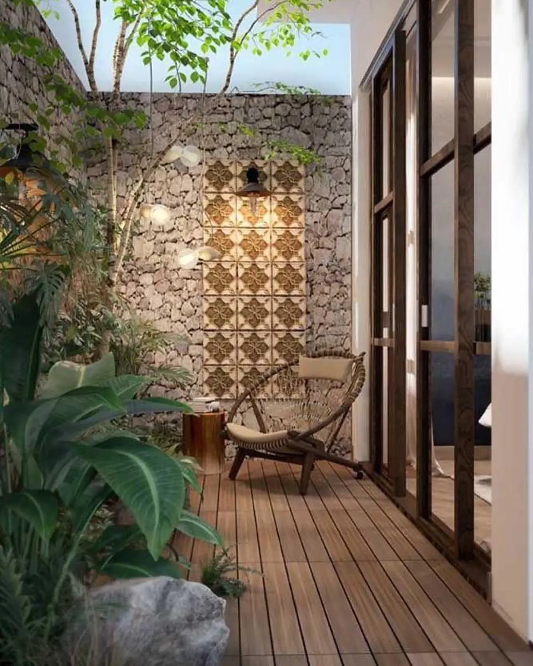 That rattan peacock chair is the perfect spot to curl up with a book or morning coffee. The natural wood decking brings such warmth, while those glass sliding doors make the boundary between inside and outside almost disappear.