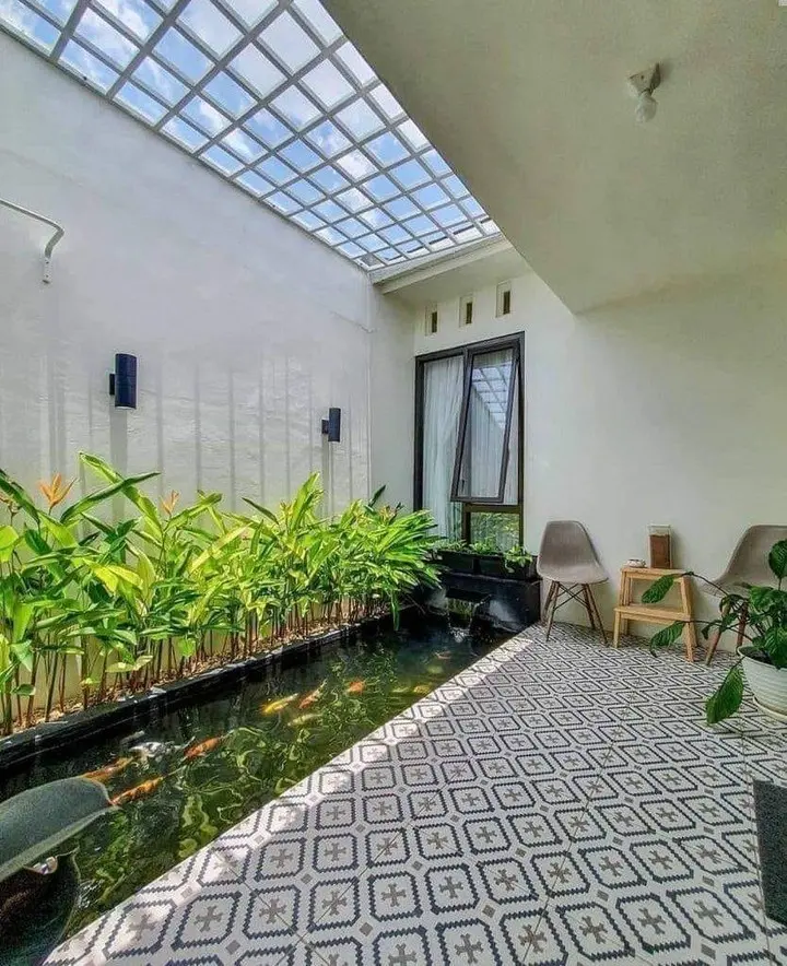 Those bright green heliconia plants add this gorgeous tropical vibe while providing privacy for the fish. The geometric patterned tile flooring is giving me serious Moroccan riad vibes, such a perfect complement to the water feature.