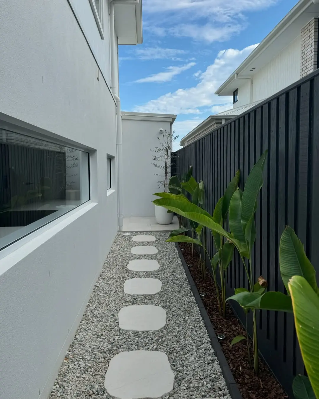 Those oversized round stepping stones create a wonderful rhythm through the crushed stone pathway. The dramatic contrast between the crisp white walls and that sleek black fence adds such architectural interest.