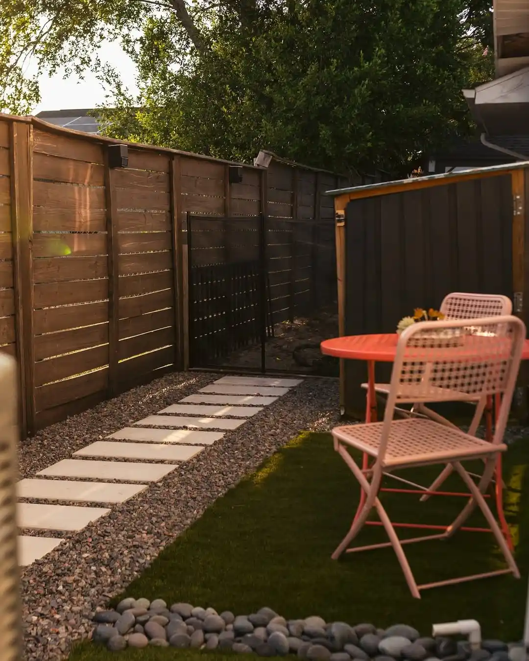That pop of color from the coral bistro table and blush pink chairs adds this perfect, playful touch against the natural wood fence. The horizontal slat fencing is right on trend, creating privacy while still letting those golden evening rays filter through.