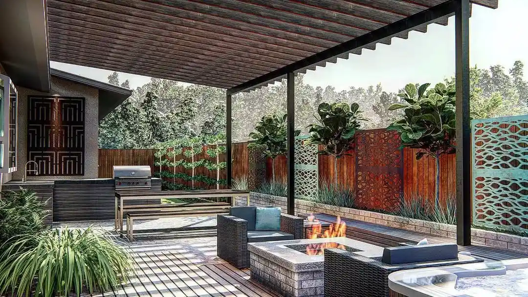 That outdoor kitchen area with the grill is ideally positioned for entertaining. I’m loving those decorative metal privacy screens with their midcentury pattern, they add interest while still maintaining that connection to the surroundings.
