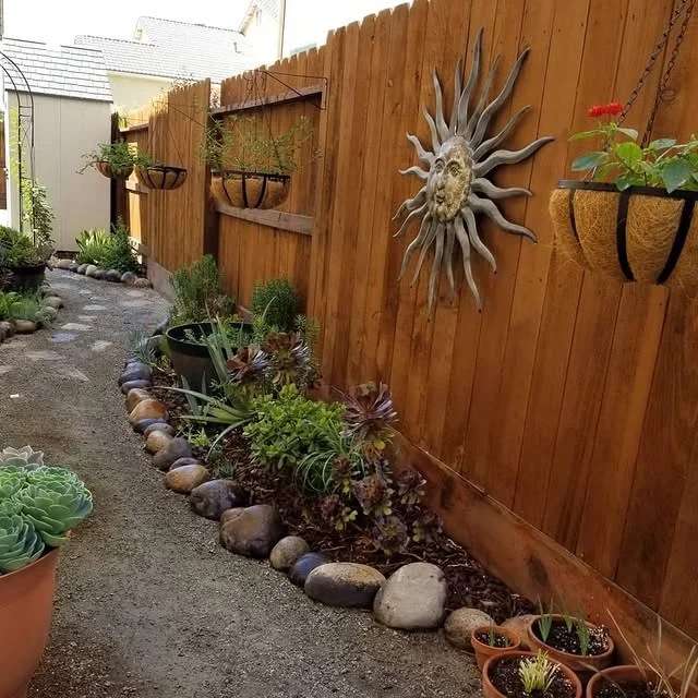 That wooden fence makes a perfect backdrop for all the decorative elements, especially that metal sunburst art piece that adds such a fun focal point. I love how they’ve used hanging coco fiber baskets to bring plants up to eye level and add vertical interest.