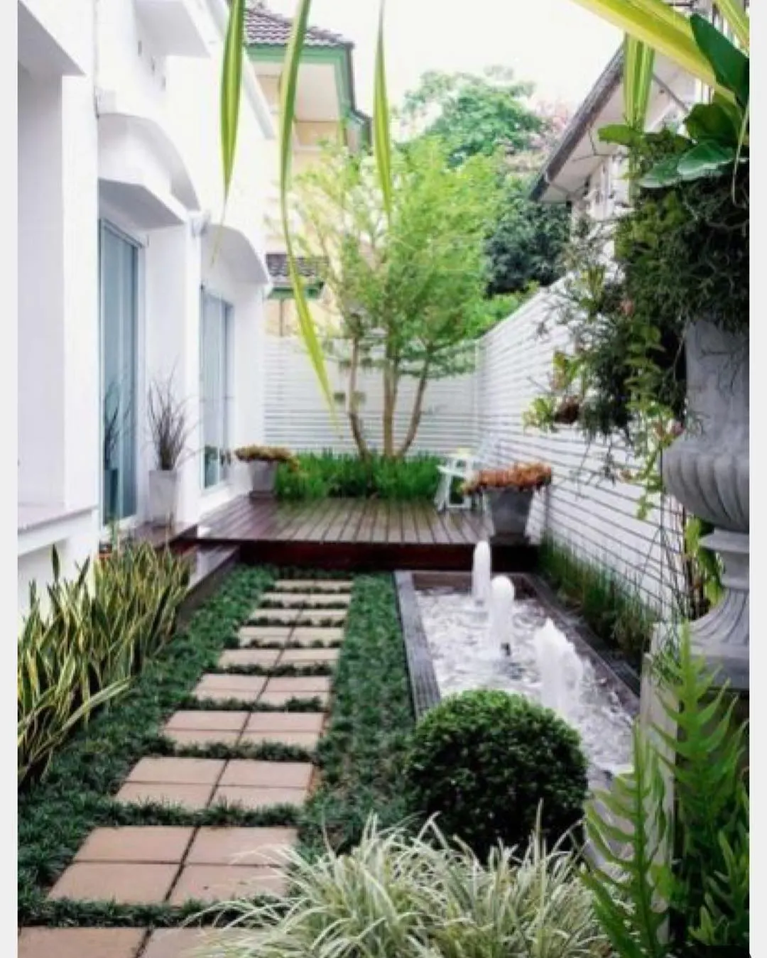 I love how they’ve used those bold bird of paradise or banana plants along the fence, those large leaves create amazing texture and movement against the rigid lines. That single slender tree or shrub in the white pot at the end creates a perfect focal point.
