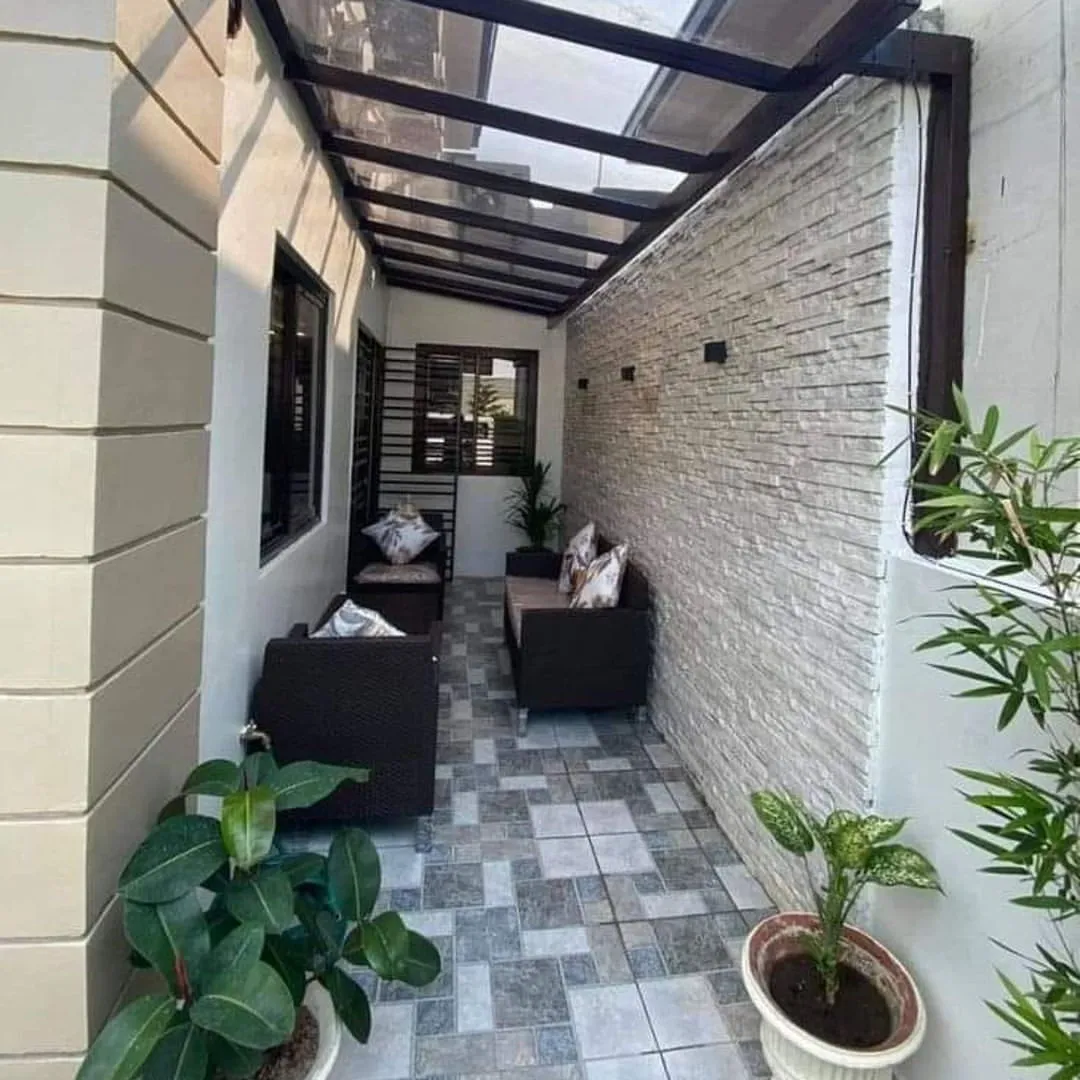 This looks like a side passage in a newer development with that semi-detached housing arrangement, perhaps in Southeast Asia or a tropical region, based on the architectural style. The covered walkway provides practical protection from the sun and rain while still looking stylish.