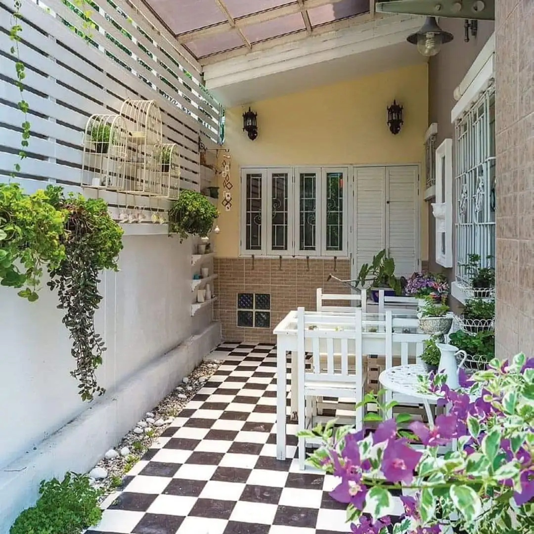 That drought-tolerant tree adds just enough height and shade without needing constant irrigation. The clean white walls on both sides make the space feel bright and open.