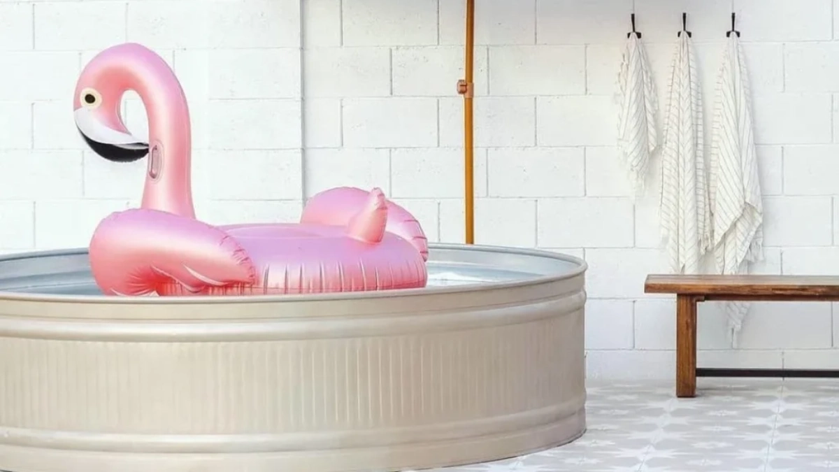 Oh wow, this setup is adorable. Someone nailed the whole chic backyard oasis vibe here. You’ve got this sleek galvanized stock tank that’s been turned into the cutest little plunge pool. The pink flamingo float just floating there is pure summer goals.